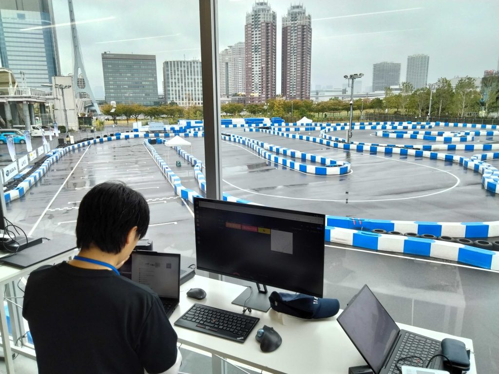 実車へのデプロイが終わると、見晴らしの良いオペレーションブースに移動します。車両とネットワークで接続しているので、ここからリモートで直接パラメータを変更するなどして挙動を調整しました。特に雨による路面のコンディションの変化が難しく、車両がスピンするリスクもある中で、「時間内にどこまでアグレッシブに攻めた走行をさせるか」